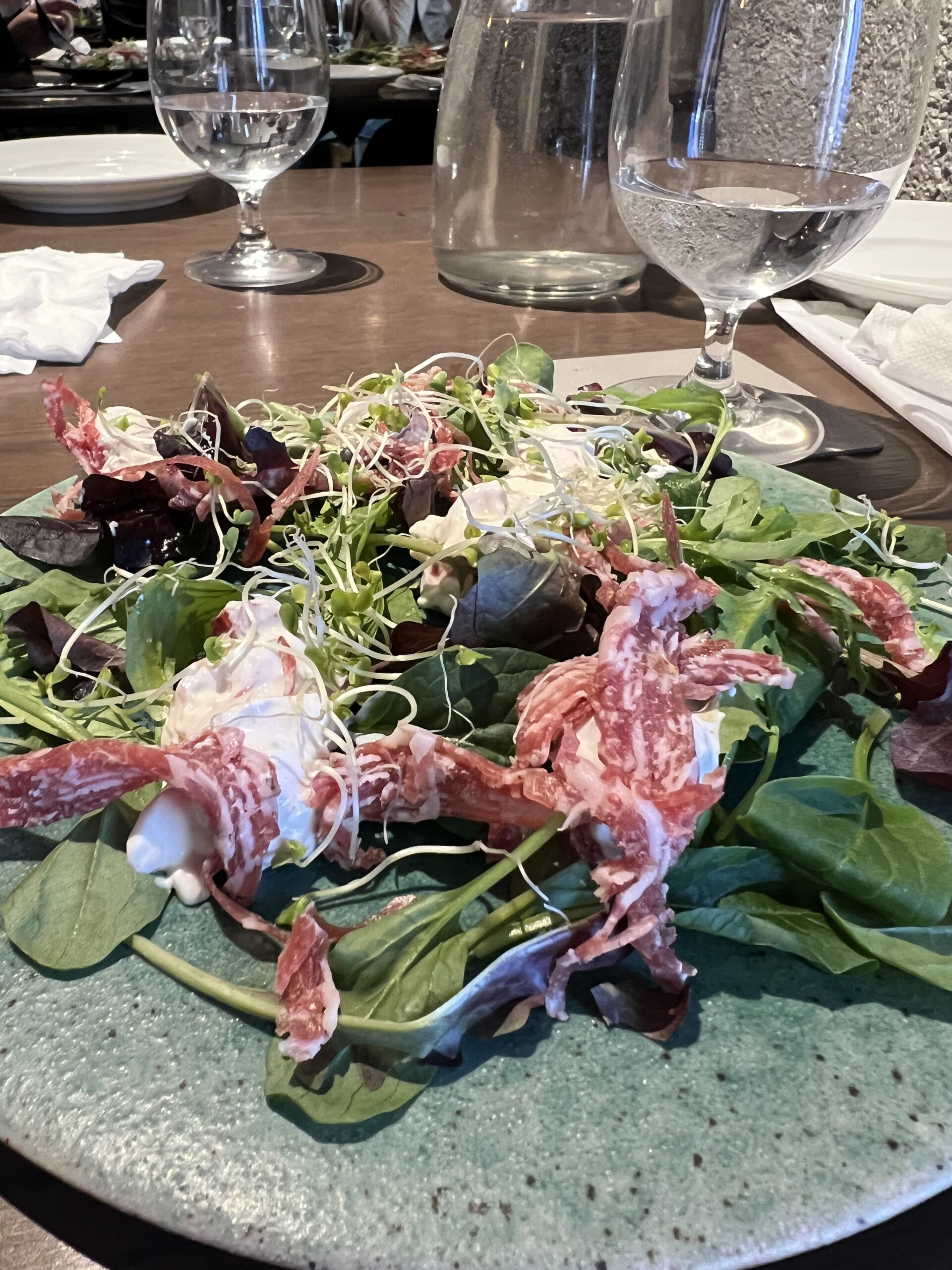 前菜は、章姫いちごとマスカルポーネを合わせたものが入っていて、さらにコッパ(豚肩ロースのサラミ)が散らしてある野菜サラダ。